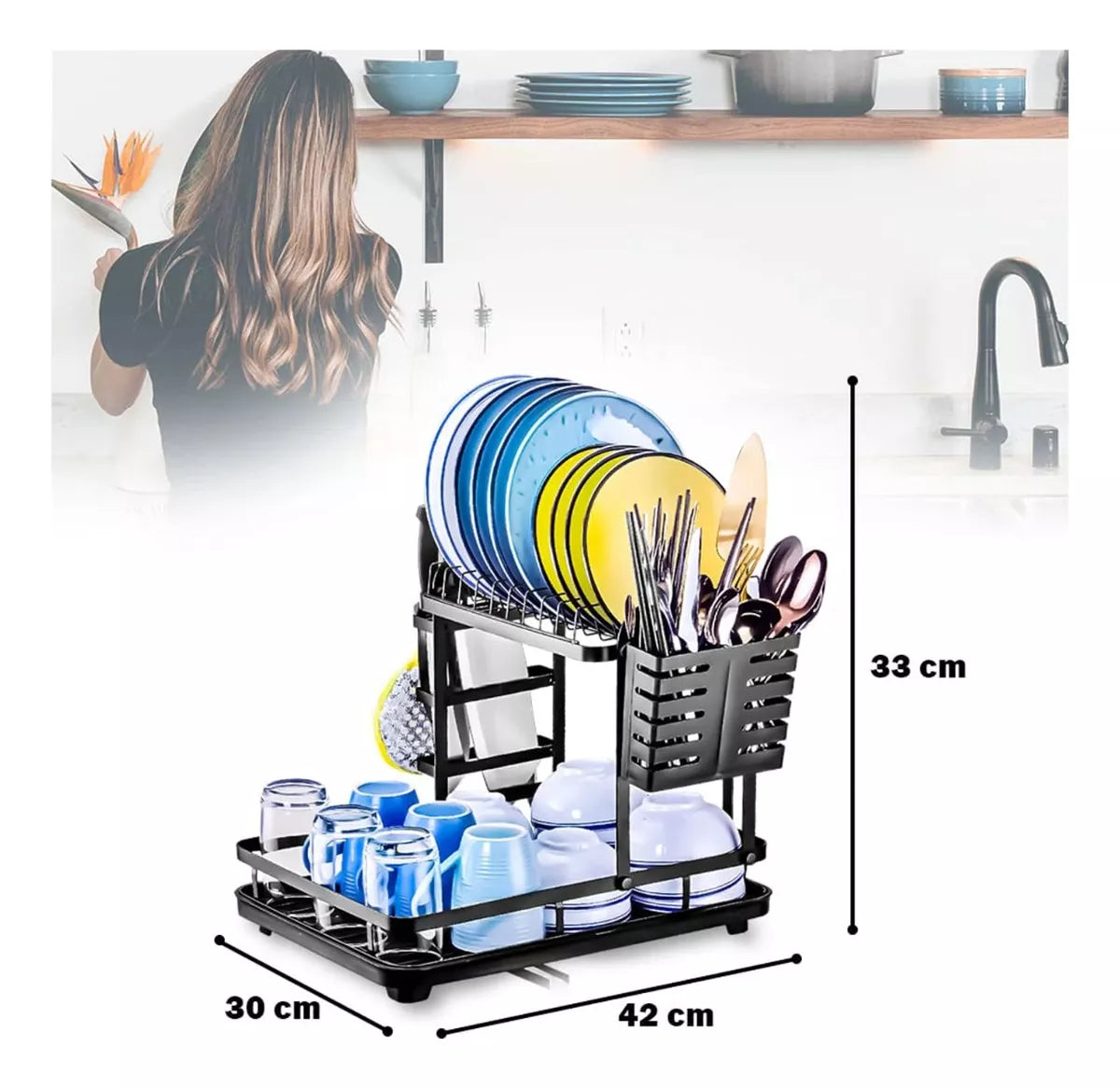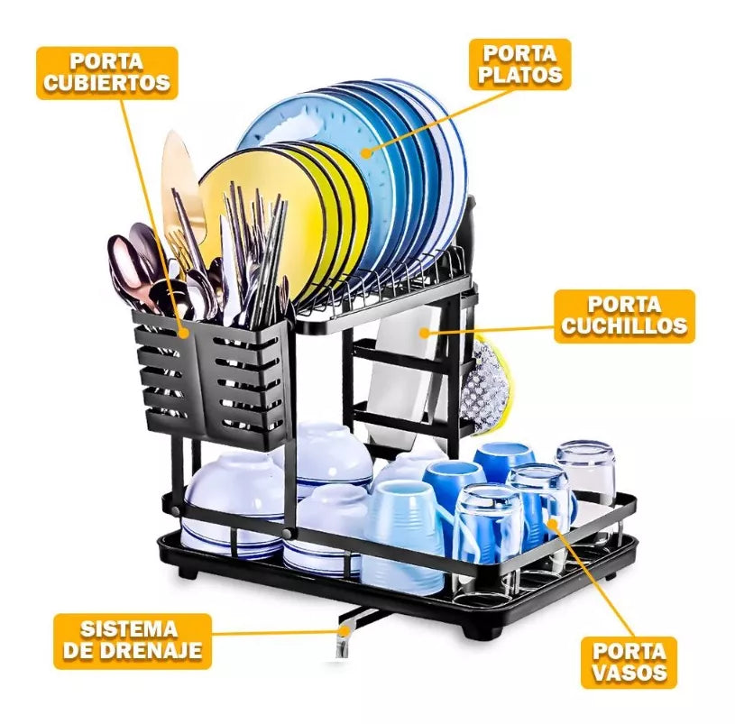Con este seca platos, ya no tendrás que pasar horas secando a mano la vajilla gracias a su práctico sistema de goteo escurreplatos. Además, es 2 en 1 gracias a sus compartimentos, podrás almacenar tus utensilios de cocina como cuchillos, tablas de picar, cubiertos o vajillas como vasos, tazas y más.